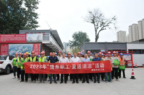 2023年7月12日上午,濰坊市總工會副主席朱建平到集團總承包施工的市重點項目濰坊市人民醫(yī)院項目現(xiàn)場進行了“情系職工?夏送清涼”走訪慰問活動,向廣大一線建設者表示慰問,并為一建公司、四建公司一線職工發(fā)放清涼物資包(天堂折疊傘、日照綠茶、六神花露水、奇強洗衣粉、舒蕾沐浴露、潔玉毛巾等)。